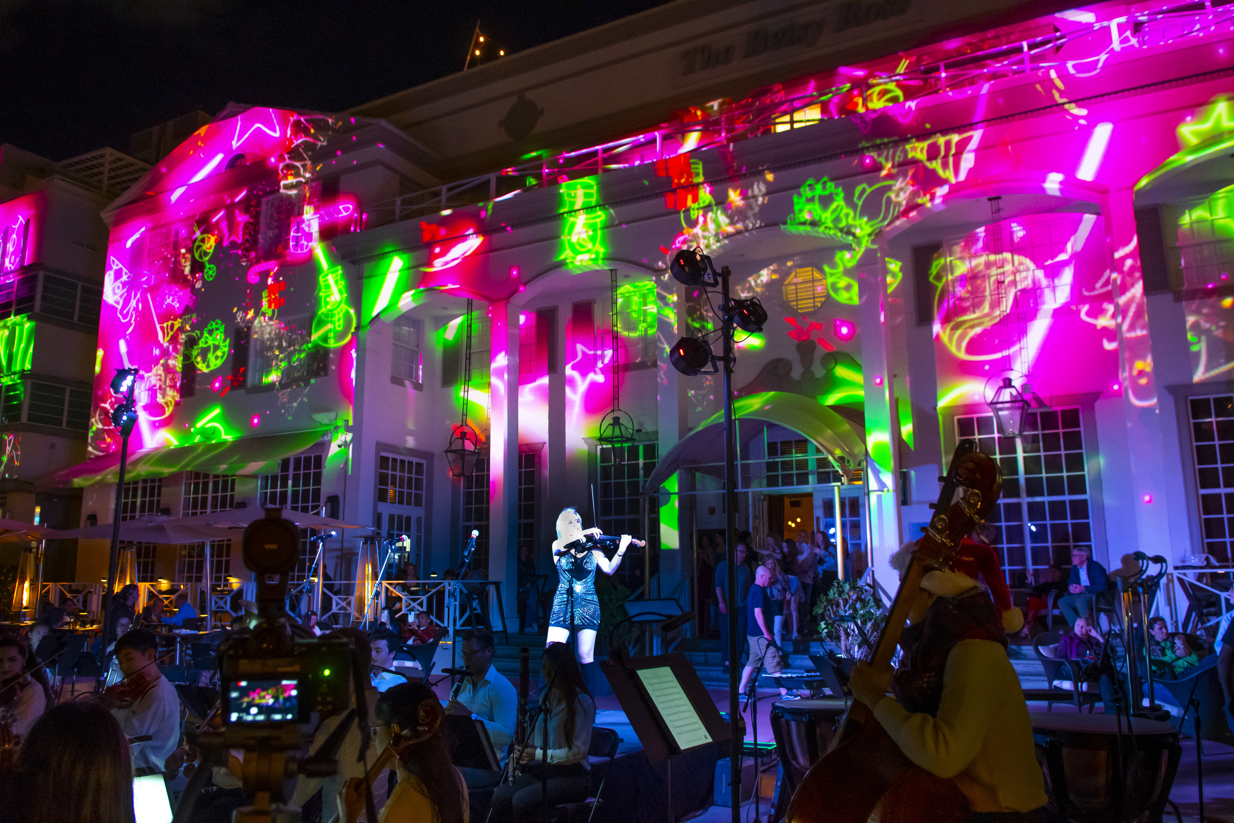 The Miami Beach Holiday Festival of Lights will make the holiday season a bit brighter with a blend of music, lights, and projection mapping displays that celebrate the rich tapestry of international holiday traditions intended to captivate audiences of all ages. Taking place from Wednesday, December 10, 2025 – Thursday, January 1, 2026 and presented by the Miami Music Festival. The festival will feature a series of live performances spanning a variety of genres and will include appearances by holiday characters such as Santa Claus, Elsa (Frozen) and the Grinch. The innovative use of projection mapping technology combined with music will create exciting and memorable experiences for all to enjoy. The technology creates vibrant imagery onto 5 iconic buildings along Ocean Drive including The Betsy. The festival will include 6 nights of performances with 16 total concerts in Miami Beach and a final afternoon performance on New Years Day at 5:00 PM. Each of the 8 nights will have three performances at 6:00 PM, 7:30 PM, and 9:00 PM.